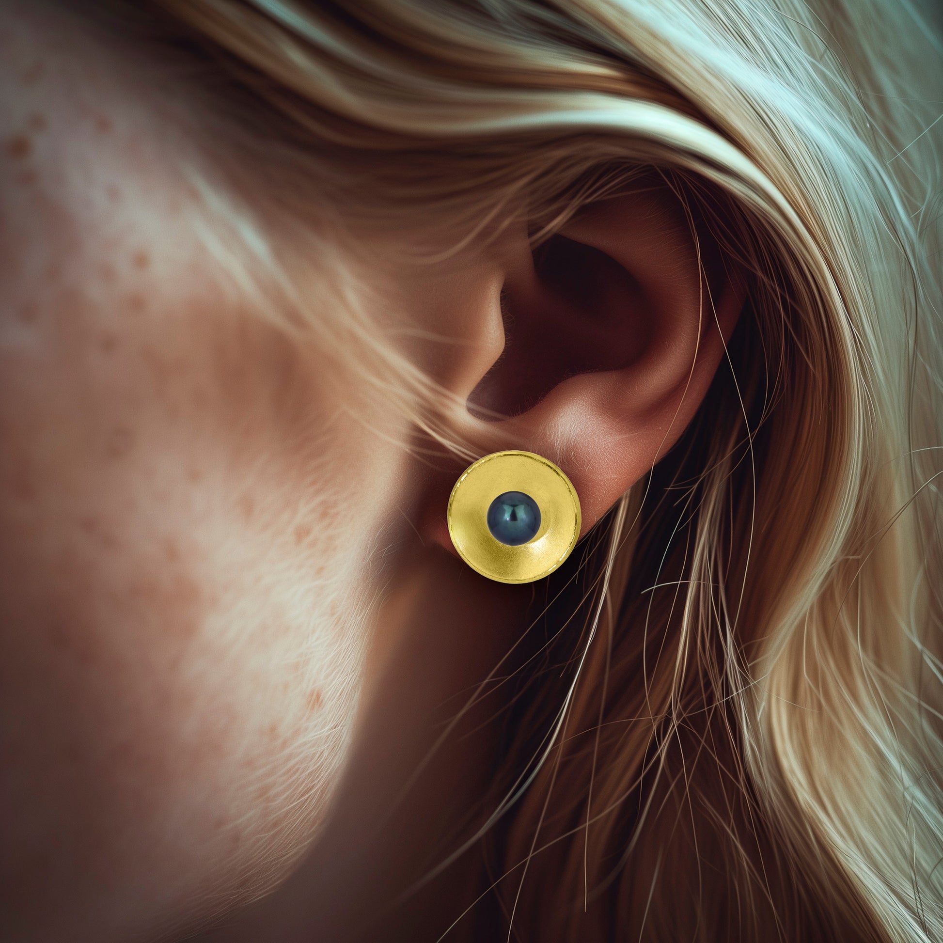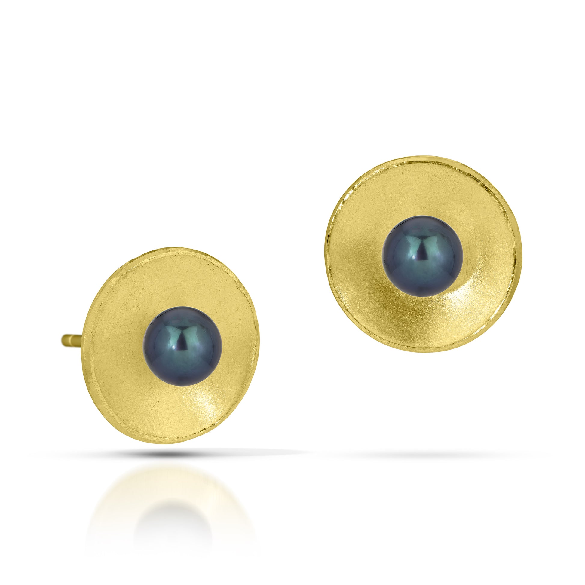 18k Gold Concave Circle Post Earrings with Pearl (Large)