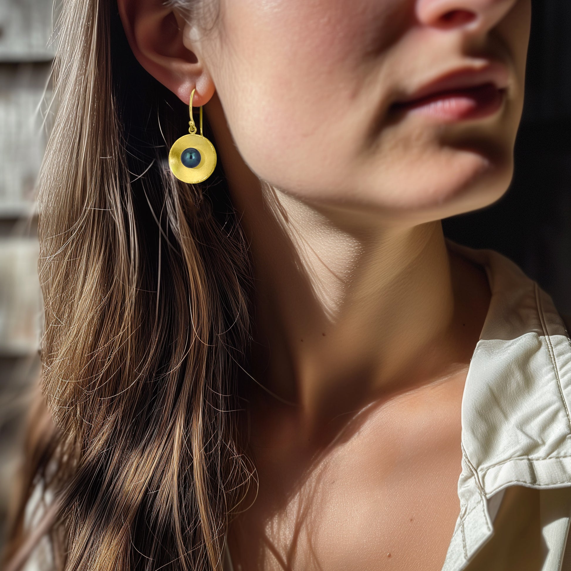 These luxe earrings are crafted from 18k gold and display a white, black or natural pearl set in a concave gold circle. Gold French hooks.