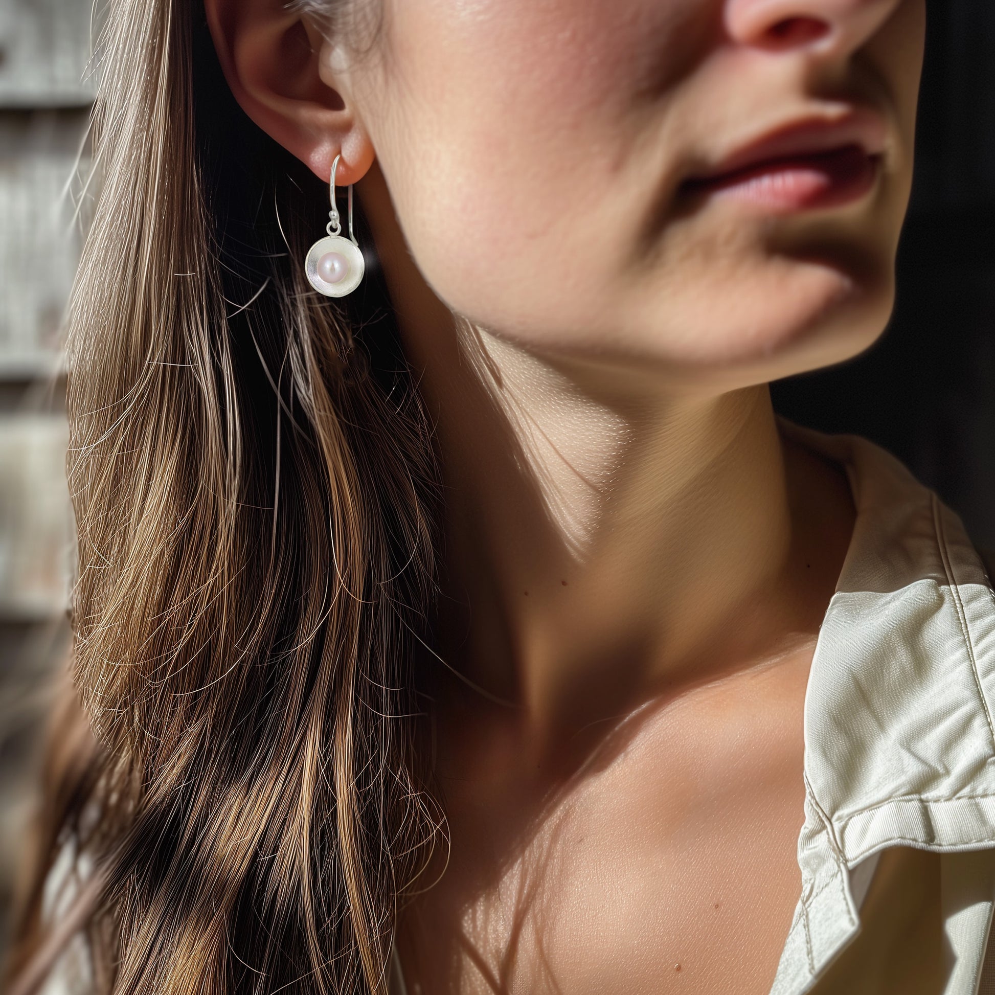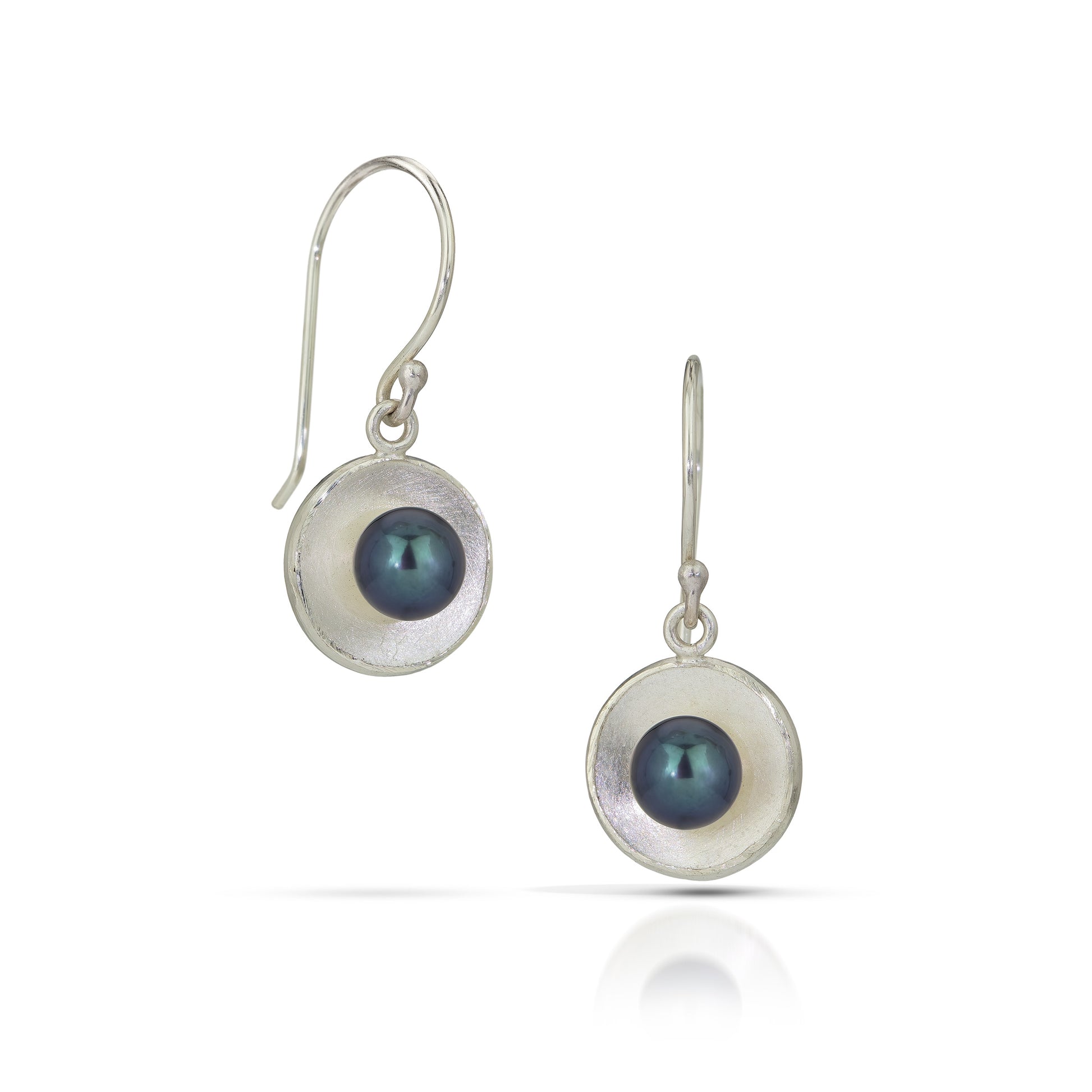 Silver Concave Circle with Pearl Drop Earrings (Small)