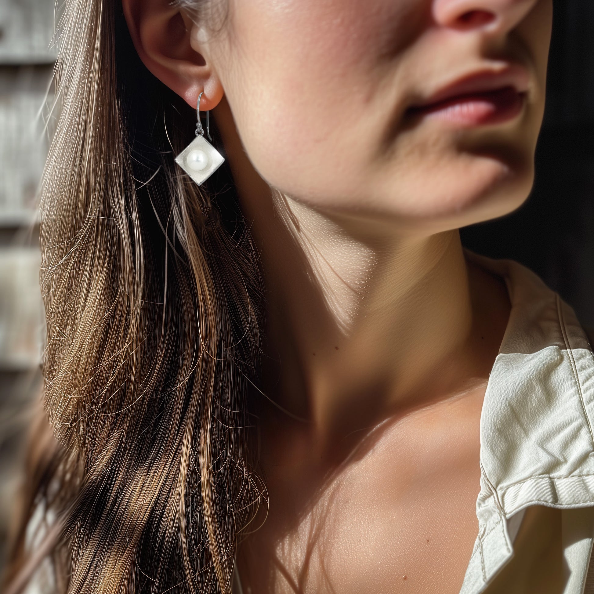 Silver Concave Square with Pearl Drop Earrings (Large)
