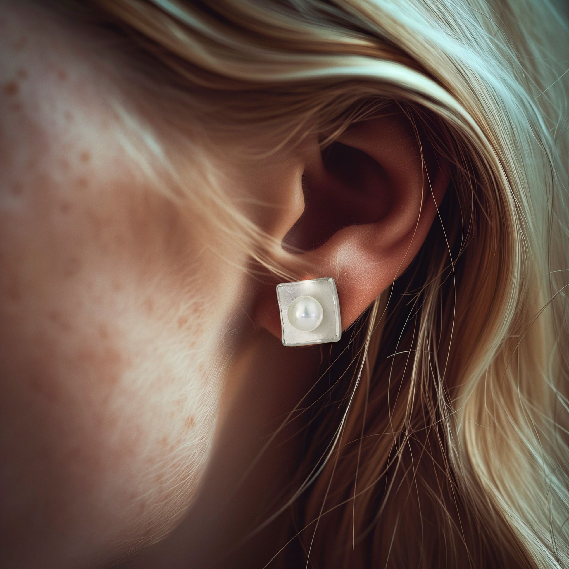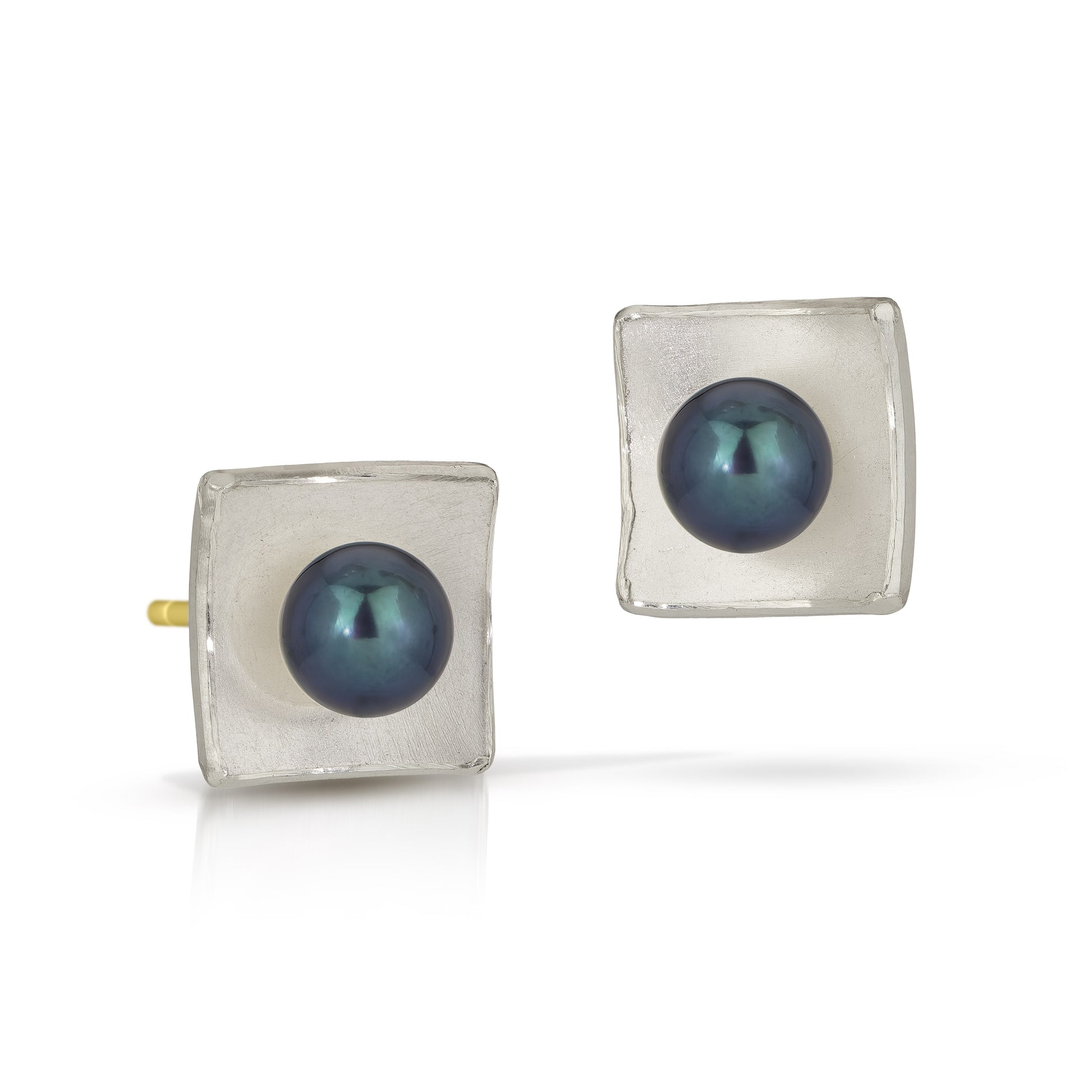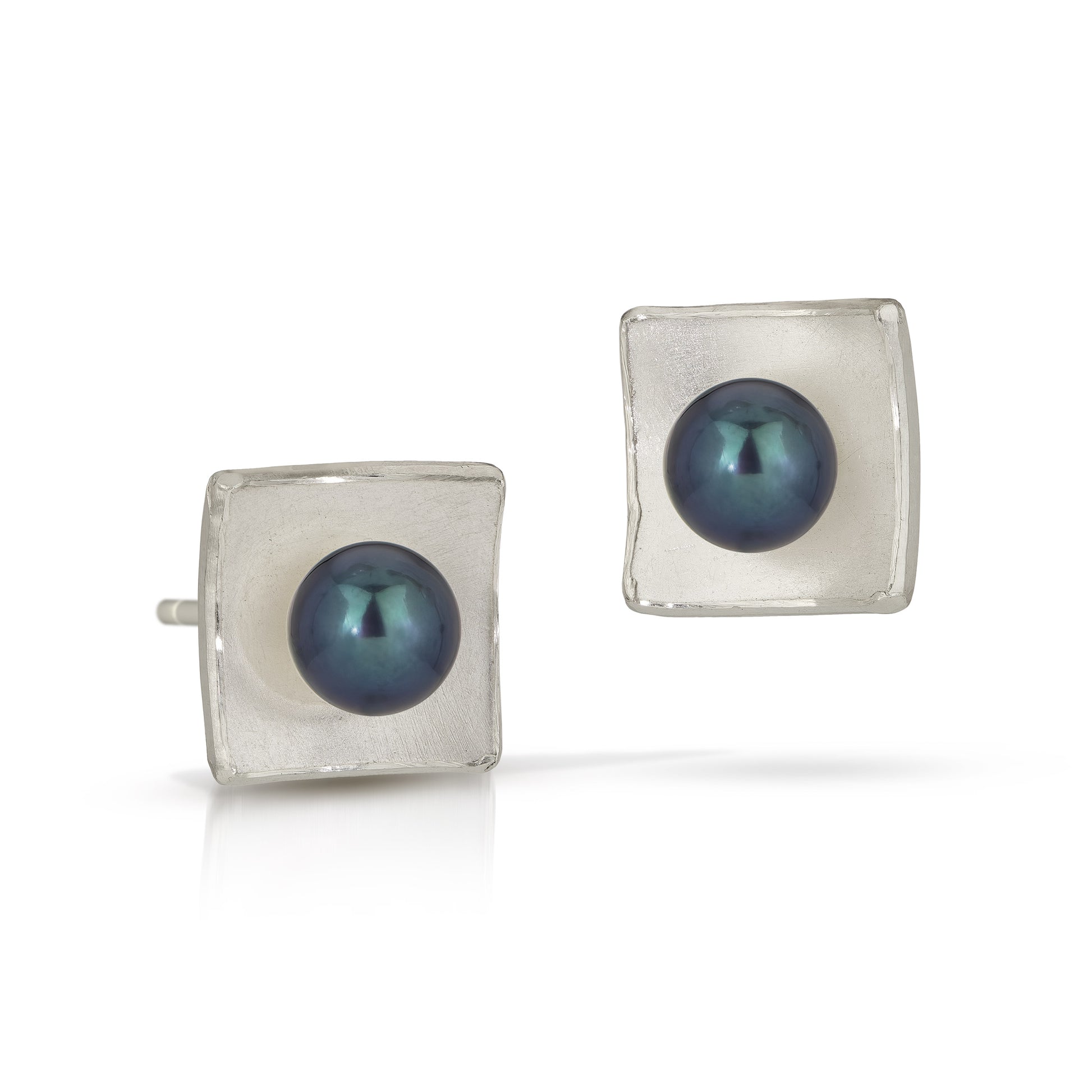 Chic and modern, these concave square post earrings are expertly crafted from sterling silver, featuring a lustrous pearl at the center for a touch of timeless elegance. Available in White, Black, and Natural pearl color.